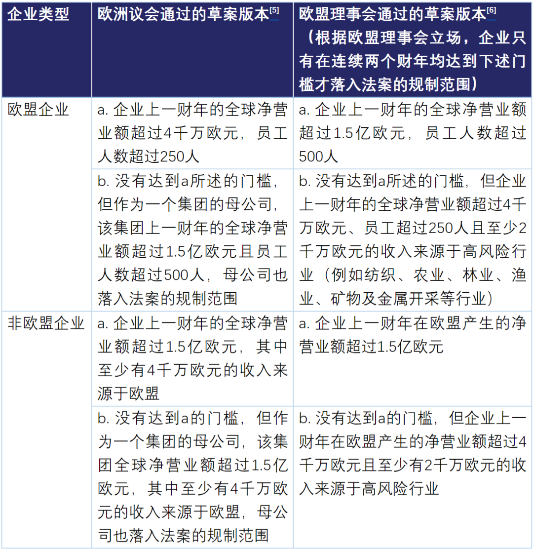 尽管上述理念已在欧洲议会及欧盟理事会之间达成共识,两机构对“大型企业”的门槛存在较大争议。与欧盟理事会通过的草案版本相比,欧洲议会进一步扩大了法案的规制范围: