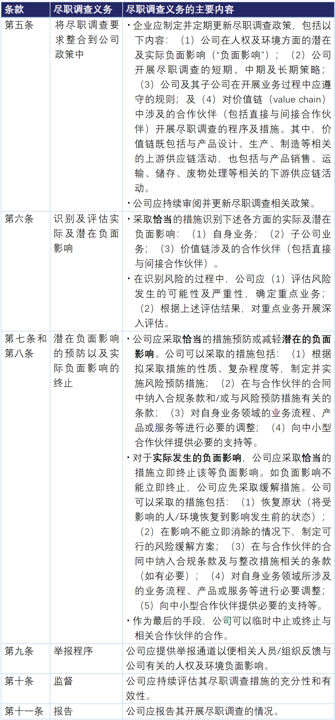 欧盟供应链法案(草案)要求落入规制范围的企业对其自身业务、子公司业务及特定供应链合作伙伴涉及的人权及环境风险承担包括风险评估、采取风险减轻措施等在内的一系列尽职调查义务。尽管欧盟理事会和欧洲议会在具体要求方面仍存在分歧,两机构在整体义务层面观点较为一致。下表主要展示了欧洲议会在每项尽职调查义务下提出的具体要求。