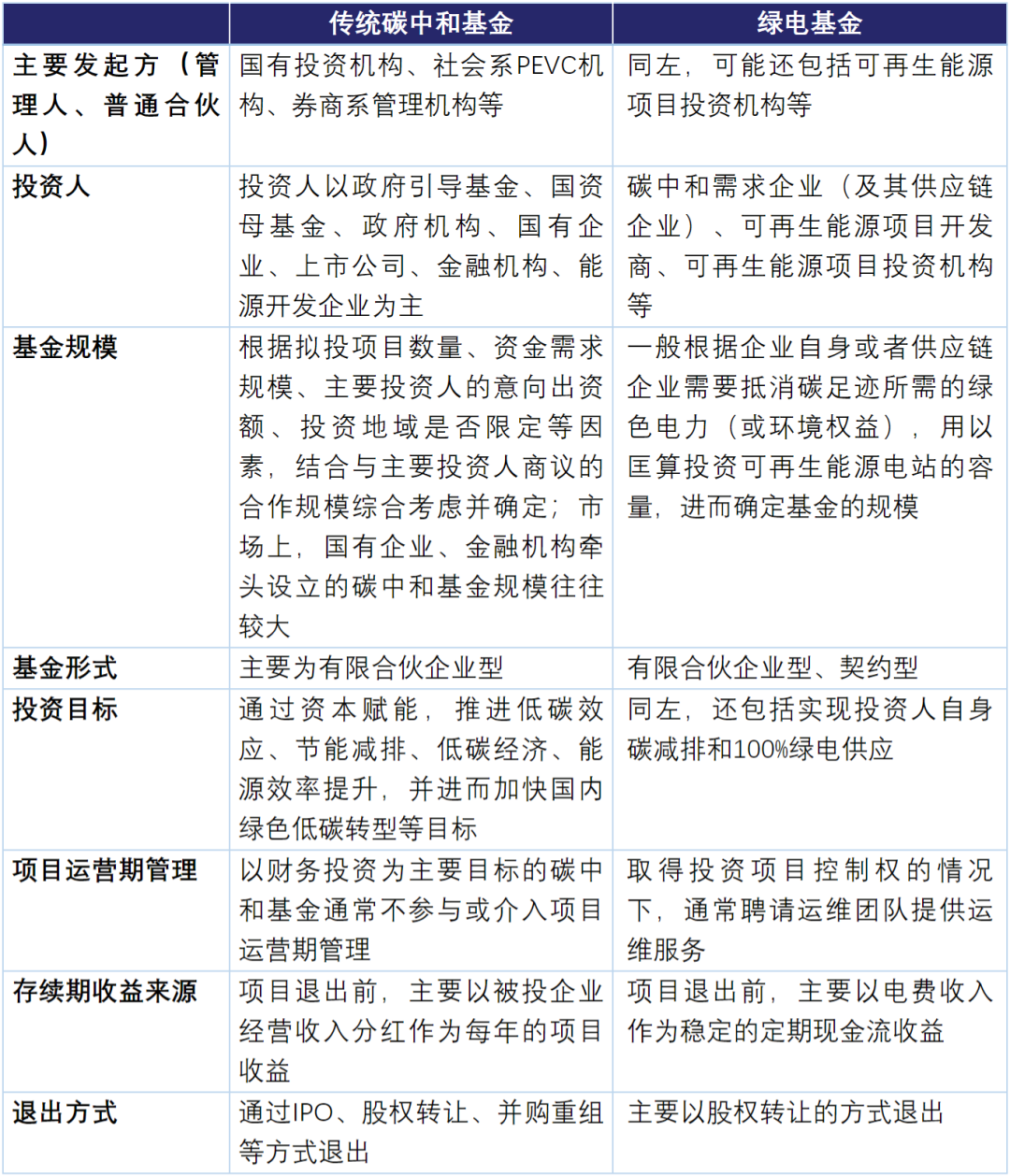 传统的碳中和私募股权投资基金主要关注可再生能源、新材料、低碳交通、绿色技术、绿色制造、绿色消费、节能环保等领域,仍主要以股权投资等适当方式支持及赋能“绿色低碳”企业,在追求可观的资本增值、财务回报的同时,客观上也能够起到推动碳减排的作用。绿电基金则在此基础上,又新增了采购绿色电力(和/或环境权益)的特殊交易安排,用于促进投资人自身碳中和,兼具传统碳中和基金共性的同时,又显示出较多特性。