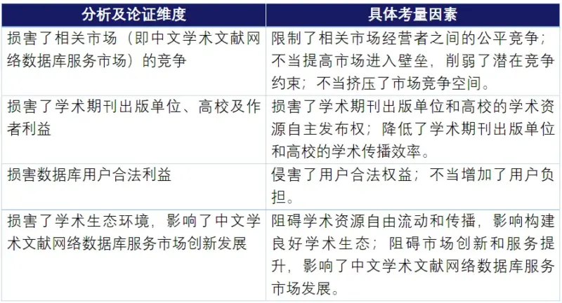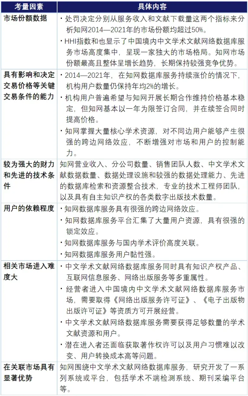 本案与此前涉及平台企业的执法案件类似,国家市场监管总局在处罚决定中从多个维度全面分析了知网的市场支配地位,包括知网的市场份额数据、市场控制能力、财力和技术条件、用户对知网高度依赖、市场进入难度以及知网关联市场的布局等因素,最终得出知网在中国境内中文学术文献网络数据库服务市场具有支配地位的结论。