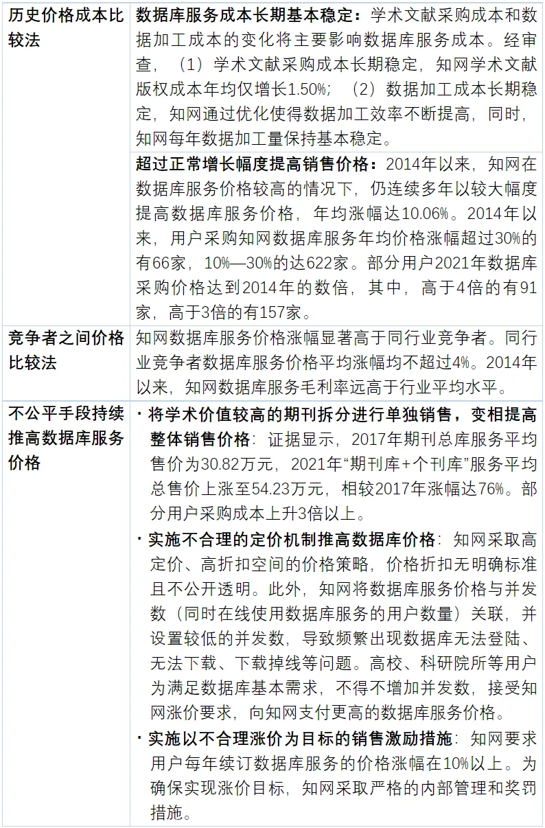 国家市场监管总局认定知网实施了不公平高价的滥用行为,采取了历史价格成本比较法和竞争者之间价格比较法,并认定知网通过不公平手段持续推高数据库服务价格。