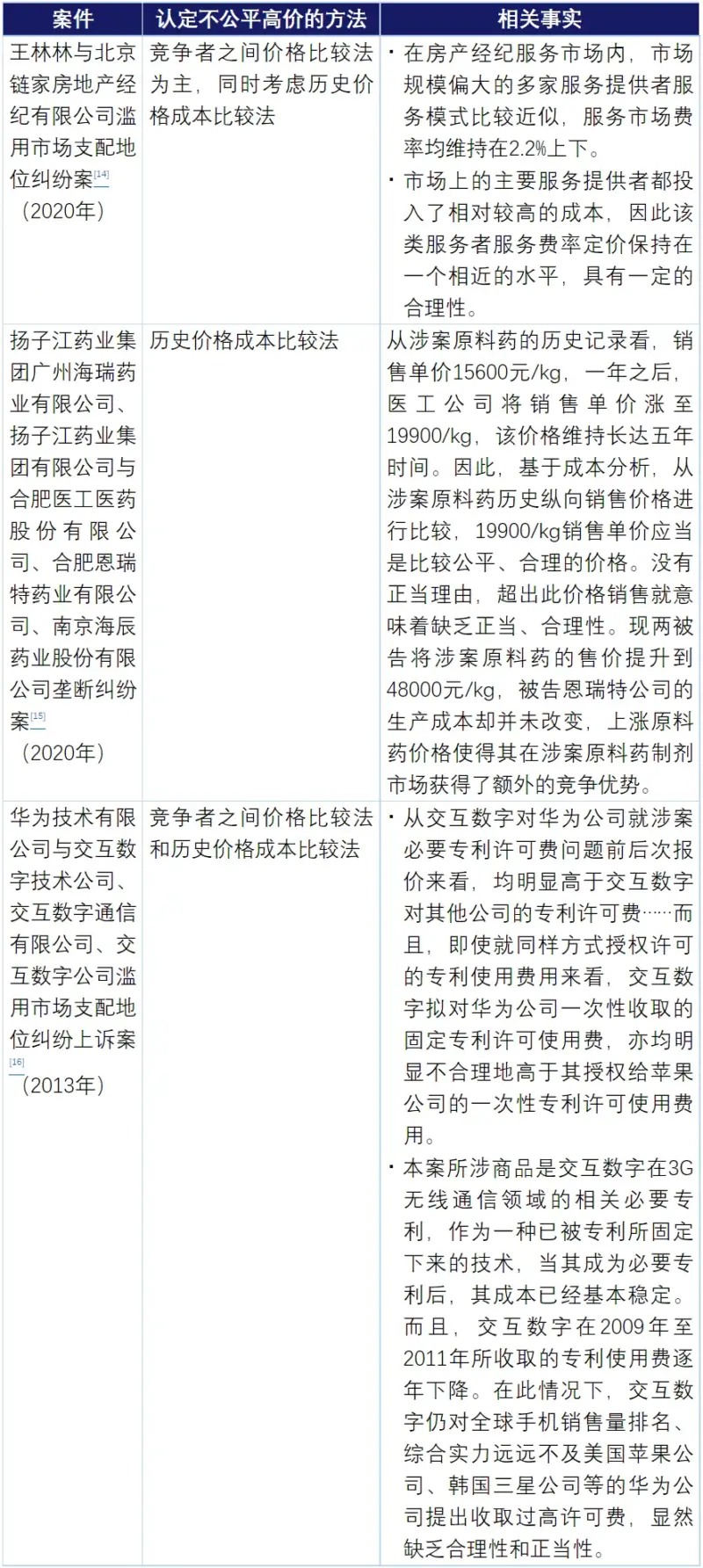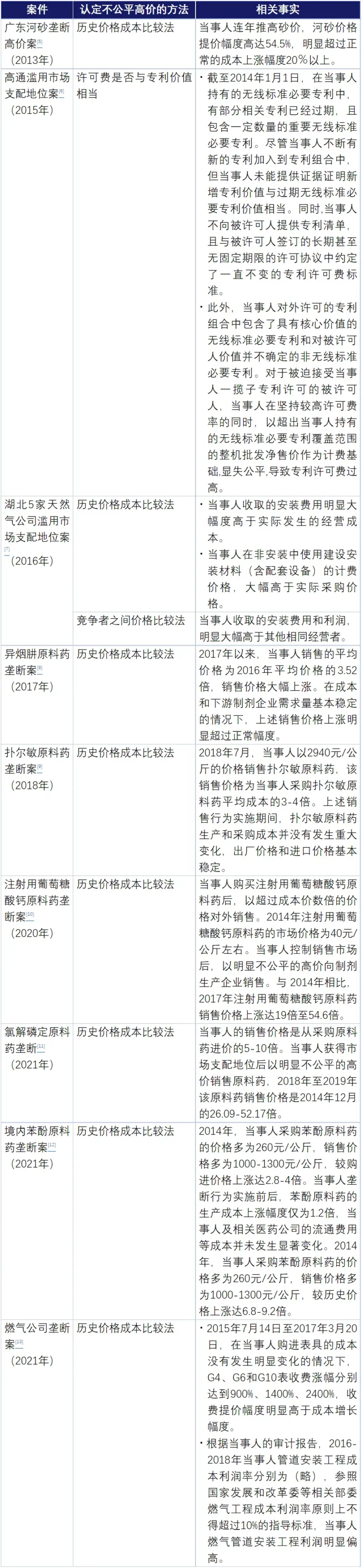 根据我们对我国反垄断执法机关公告案件的整理,截至2022年12月,包括本案,反垄断执法机关共计查处了10起涉及不公平高价的案件,其所采用的认定不公平高价的方法和相关事实总结如下。从过往案例中可以看出,历史价格成本比较法是最常使用的分析方法: