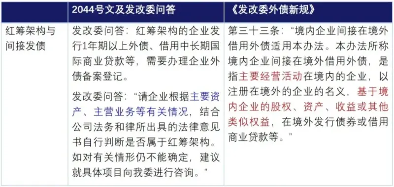 对于上述变化,我们主要关注:《发改委外债新规》中所定义的间接发债,是否仍然是指市场上通常理解的红筹架构企业借用外债,还是其将扩展至非红筹架构但“主要经营活动在境内”的纯境外企业借用外债?具体而言: