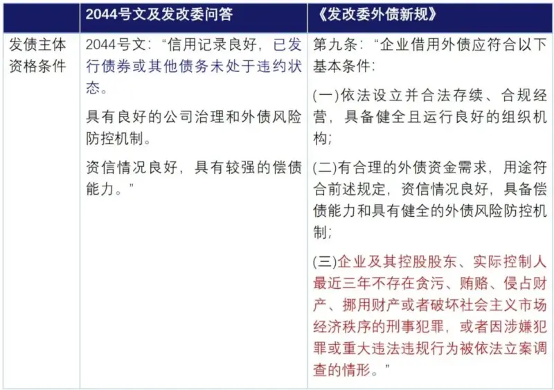 在发债主体资格要求方面,相对于2044号文所规定的发债主体资格条件,《发改委外债新规》删除“已发行债券或其他债务未处于违约状态”的限制,增加了对于控股股东、实际控制人最近三年无重大违法违规的相关要求。