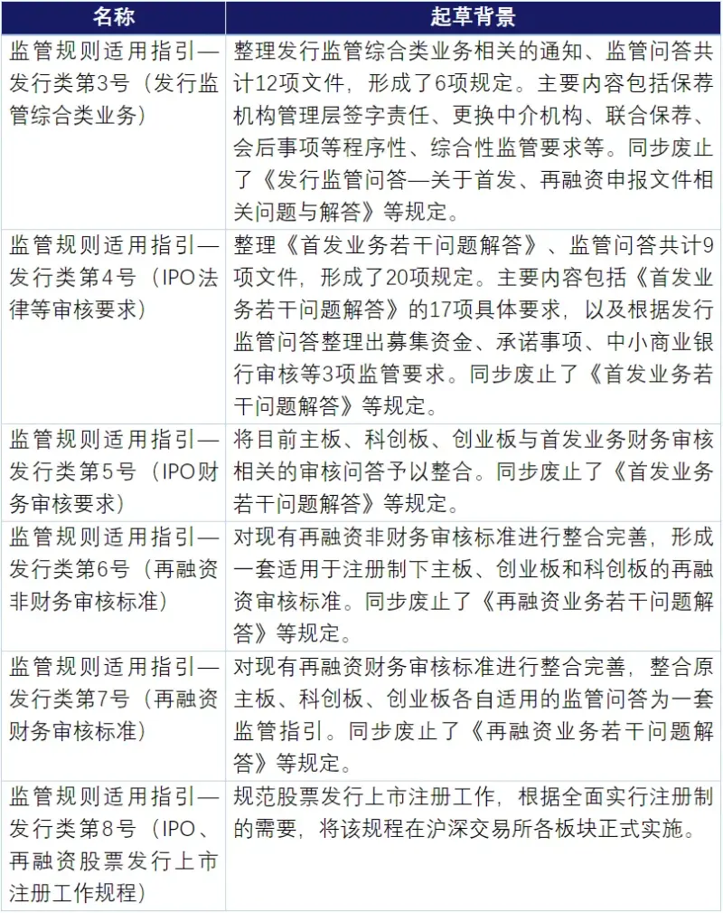 除在全面注册制制度征求意见稿的基础上结合社会公众意见进行修订外,中国证监会于2023年2月17日另外发布境内IPO、再融资系列监管规则适用指引(“监管指引新规”),对原有的IPO、再融资审核要求进行调整。监管指引新规的基本情况如下: