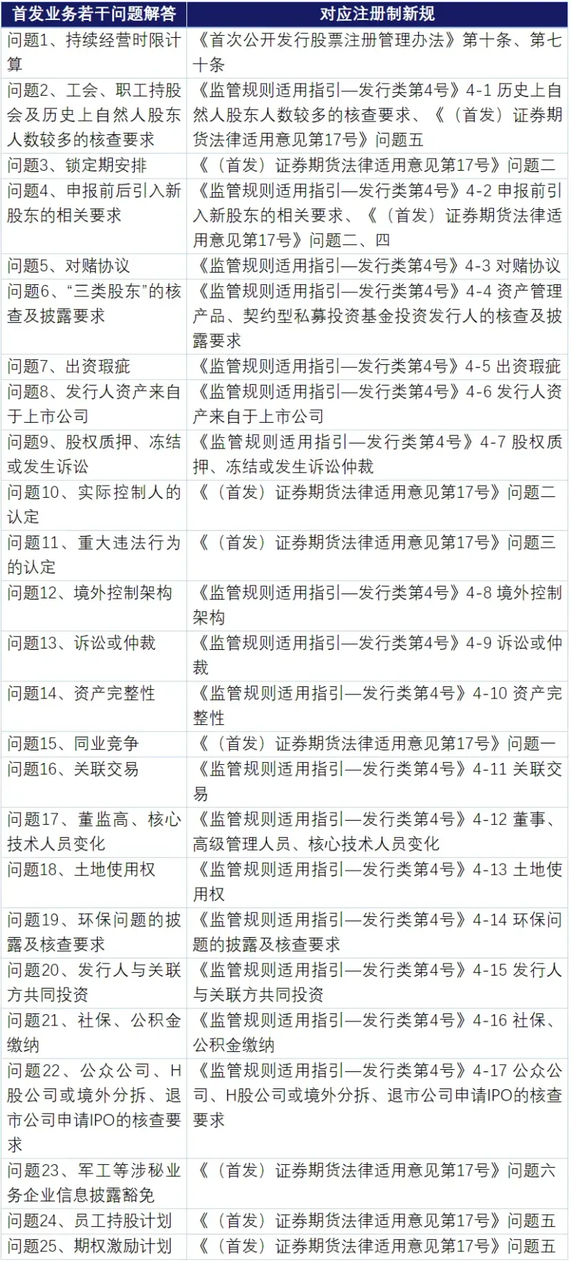 此外,《首发业务若干问题解答》《上海证券交易所科创板股票发行上市审核问答》《上海证券交易所科创板股票发行上市审核问答(二)》《深圳证券交易所创业板股票首次公开发行上市审核问答》《再融资业务若干问题解答》已被废止,但前述问答中的问题并非全部收录到监管指引新规中,部分问题整理到《(首发)证券期货法律适用意见第17号》《(再融资)证券期货法律适用意见第18号》等其他规定中。为方便查阅,我们对《首发业务若干问题解答》中的法律相关问题与注册制新规的对应情况做了初步梳理,主要如下: