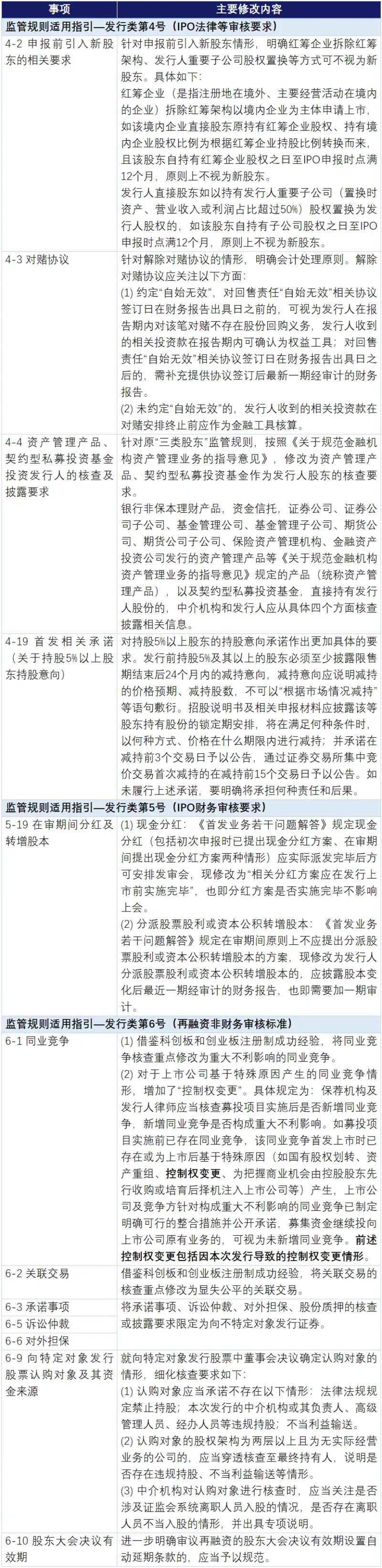 与原境内IPO、再融资有关问答规定相比,监管指引新规涉及法律审核条线的重点修改内容如下: