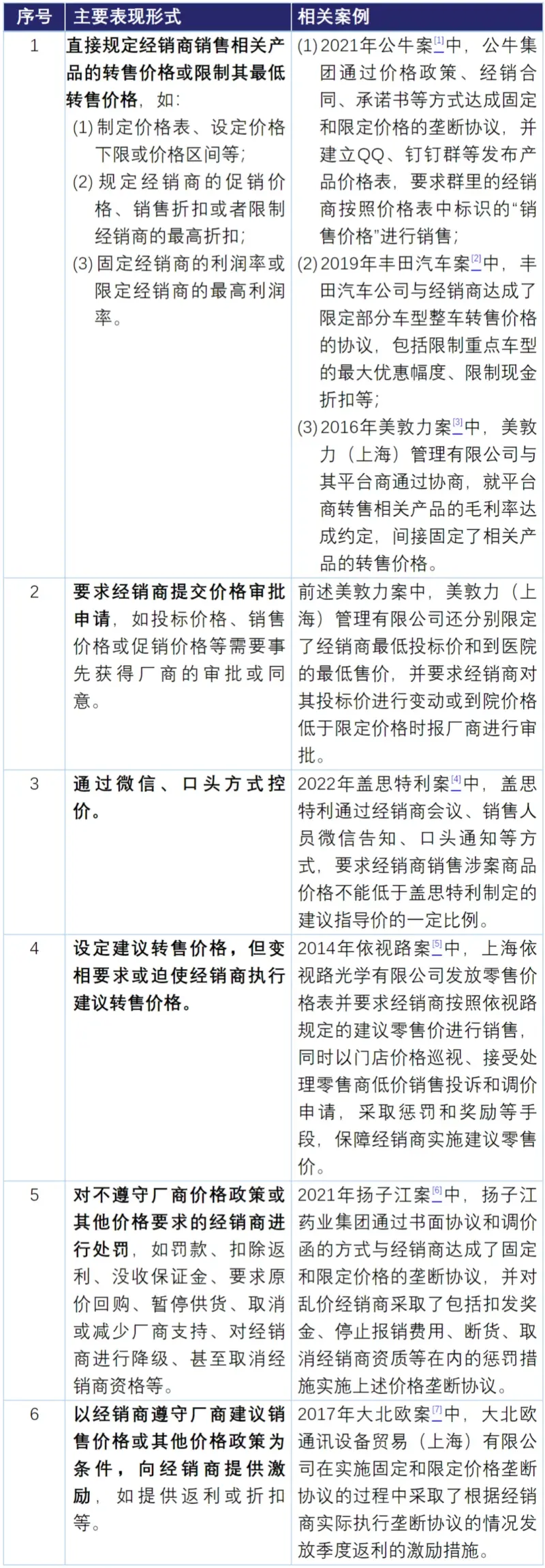 转售价格维持行为的具体表现形式多样,不一而足。根据现有法律规定和执法实践,其主要表现形式参见下表: