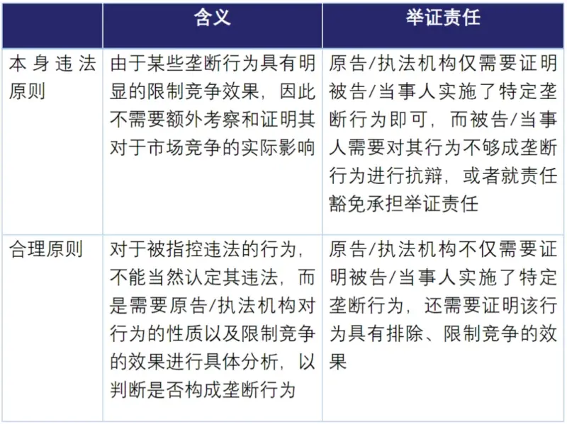 本身违法原则(rule of per se illegal)与合理原则(rule of reason)是国际反垄断司法实践中发展出来的认定垄断协议违法性的两个基本原则。例如,美国对于转售价格维持的规制原则经历了由本身违法原则向合理原则的转变。而欧盟竞争法则仍然将纵向价格垄断协议作为核心限制(hard-core restriction),存在转售价格维持的事实即可认定违法,但当事人可根据《欧盟运行条约》第101条第(3)款申请个案豁免。