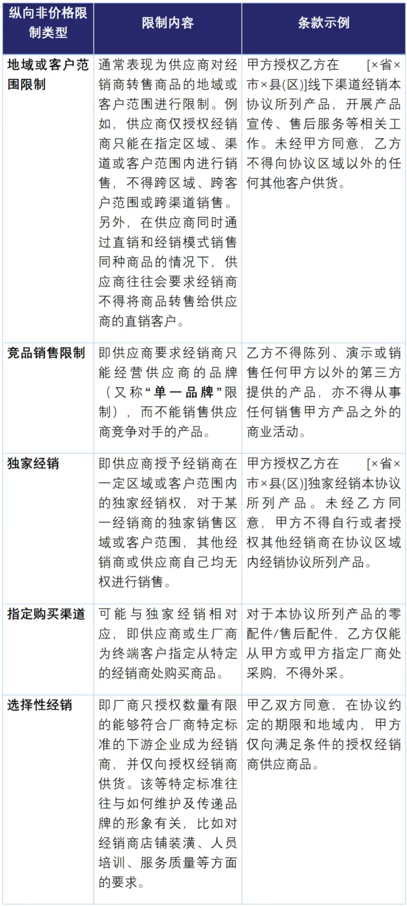 商业实践中,除了转售价格维持这类典型的纵向限制外,还包括其他非价格方面的限制。如比较常见的地域或客户范围限制、竞品销售限制、独家经销、指定购买渠道、选择性经销等,从反垄断合规体系全面性角度亦应予以充分重视。