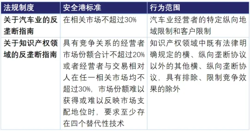 另外,在知识产权、汽车等特定领域的相关反垄断指南中也涉及安全港相关规定,基于特殊法优先适用于一般法的原则,我们理解这些针对特定领域的安全港标准优先适用于《反垄断法》修正案规定的安全港标准。