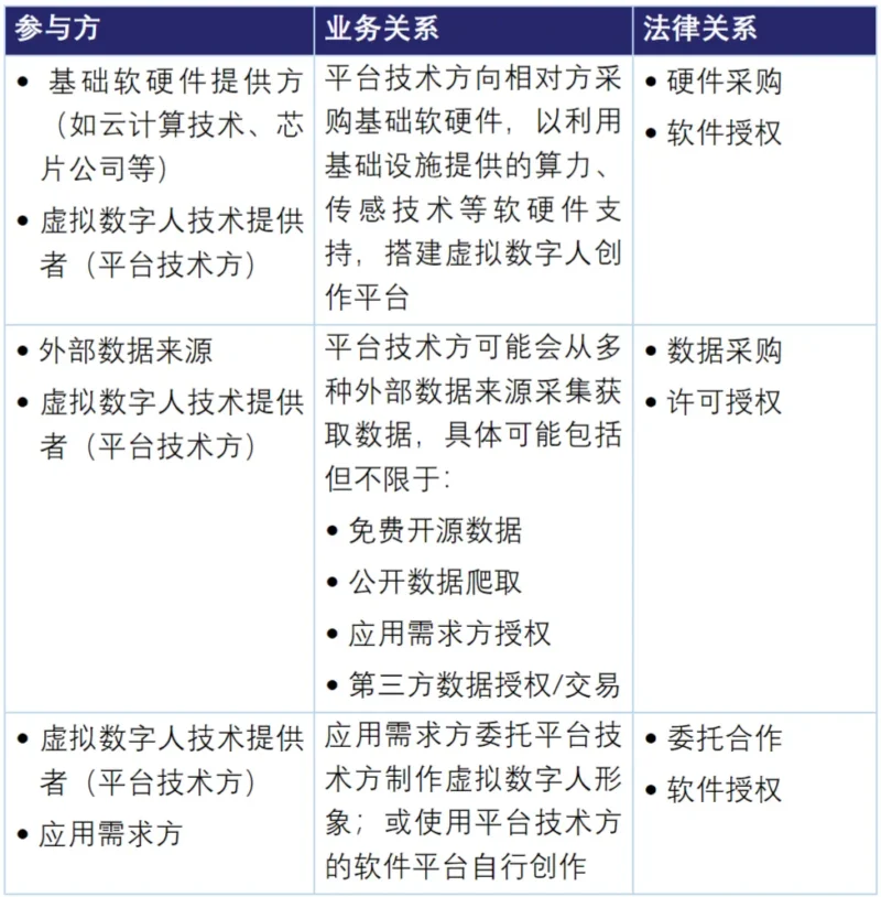 在制作阶段,一个虚拟数字人项目会涉及基础层、平台层以及应用层等不同层面、多方主体的互动交涉,这一过程主要涉及的业务关系和法律关系如下: