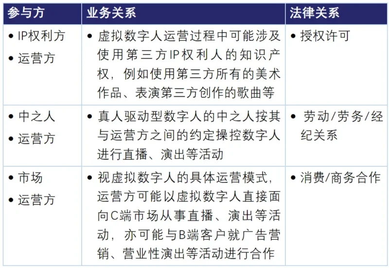 在虚拟数字人的商业化应用阶段,可能会涉及到的关键参与方包括虚拟数字人的运营方、目标市场方、提供关键知识产权的合作方以及“中之人”(即虚拟数字人背后的演员或操作者)等多方主体,其主要业务关系和法律关系如下: