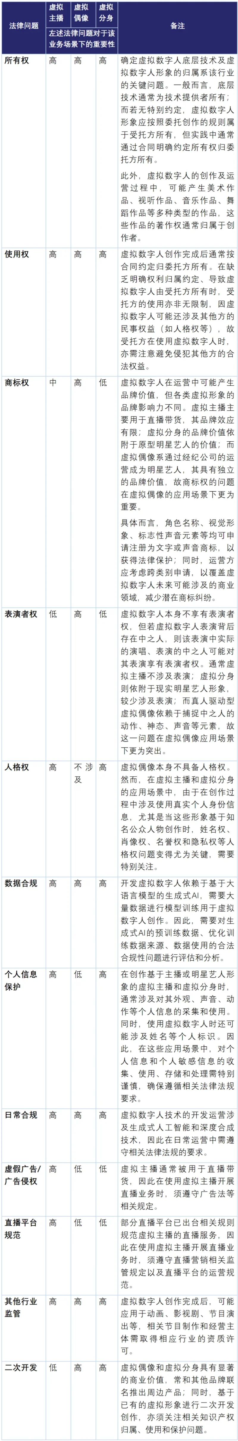 在虚拟数字人业务领域,所有权、使用权、知识产权、合规性等是业务开展时常见的重要法律问题,而这些法律议题的重要性也随着具体应用场景的不同而有所差异。对虚拟主播、虚拟偶像和虚拟分身等应用场景而言,由于其创作与合作模式、应用方式、商业价值的侧重点有所不同,在处理相关法律问题时的侧重点亦应随之调整,具体可见列示如下: