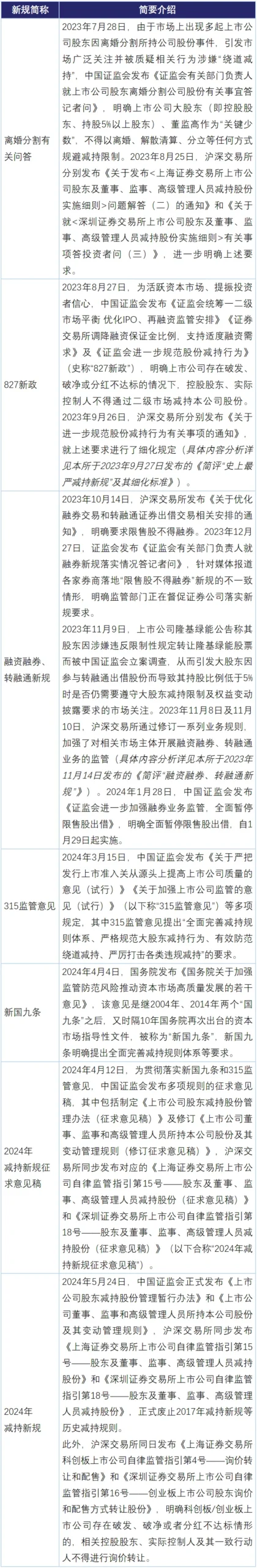 2023年以来,市场上出现多起上市公司股东离婚分割股份、转融通出借股份等事件,引发市场广泛关注并被质疑涉嫌“绕道减持”。中国证监会及沪深交易所自2023年7月起通过陆续发布通知、问答等方式不断完善现有减持规则体系,并表示正在抓紧修改《上市公司股东、董监高减持股份的若干规定》。2024年4月,国务院发布“新国九条”并明确要求出台上市公司减持管理办法。2024年5月24日,中国证监会正式发布《上市公司股东减持股份管理暂行办法》《上市公司董事、监事和高级管理人员所持本公司股份及其变动管理规则》,沪深交易所同步发布对应的规则(以下合称“2024年减持新规”),自此2017年减持新规被废止,减持新规正式完成修订。