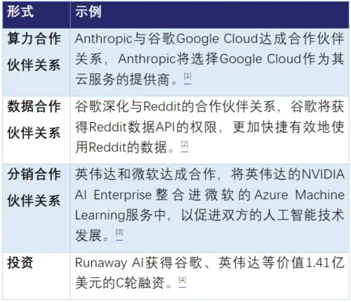 实践中,“合作伙伴关系”在人工智能领域具有多样化的表现形式,从合作形式上,可能包括各种内容的合作、缔结战略合作协议、投资、人才挖掘等形式,示例如下: