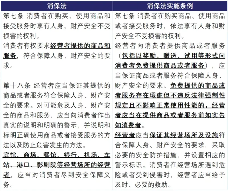 除对产品保障义务的范围进行扩大外,《消保法实施条例》第七条第三款还扩大了经营者的经营场所安全保障义务,明确将所有经营者的经营场所及其设施都纳入应当尽到安全保障义务的范围,对于安全保障义务的要求则进一步细化为采取必要的安全保护措施,设置相应的警示标识,并要求经营者在消费者在经营场所遇到危险或受到侵害时应给予及时、必要的救助。《消保法实施条例》该等主动救助义务条款,对于经营者提出了更大的挑战,特别是对于近年来无人零售便利店、产品互动体验店等多种新零售业态,需要在《消保法实施条例》实施后的具体案例中探讨该等救助义务的具体责任边界。