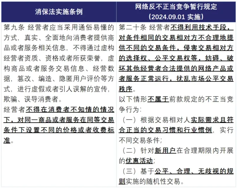 此前“大数据杀熟”问题已在多个法律法规中体现,如《个人信息保护法》第二十四条,《电子商务法》第十八条,《国务院反垄断委员会关于平台经济领域的反垄断指南》第十七条等,即将于2024年9月1日起实施的《网络反不正当竞争暂行规定》的第二十二条中同样也就“大数据杀熟”行为进行规制。