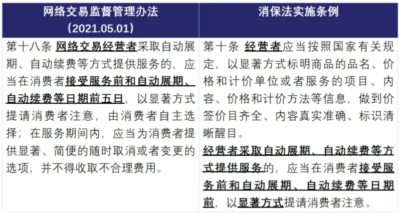 《消保法实施条例》第十条中对于经营者在“自动展期”“自动续费”方式提供服务中的两次提醒义务的规定早在《网络交易监督管理办法》中就有所体现,《消保法实施条例》将该等义务主体从网络交易经营者扩大适用至所有经营者。同样的,我们认为在叠加场景下,两项规定应当同时适用。
