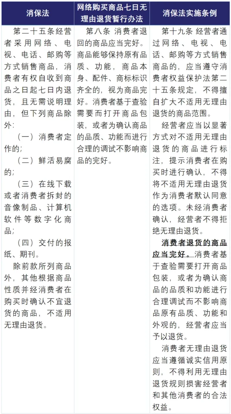 除不适用七天无理由退货的产品范围外,无理由退货的“完好”前提也在实践中面临颇多争议,何者构成“消费者基于查验需要打开商品包装,或者为确认商品的品质和功能进行合理调试而不影响商品原有品质、功能和外观”的例外也存在解释上的不确定性。虽然《网络购买商品七日无理由退货暂行办法》对于商品完好的一般标准、不同类商品完好的特定标准进行了规定,但仍然无法涵盖实践中复杂多变的交易情形。