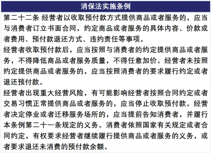 近年来,预付式消费在实践中乱象频出,例如预付费后经营者“跑路”、服务品质下降、退费难等等,对消费者合法权益造成严重损害,故规范预付式消费成为《消保法实施条例》的一个重点。预付式消费的本质特点是消费者的付款具有先履行性,而经营者所承担的义务具有滞后性,中国消费者协会发布的《2023年预付式消费领域消费者权益保护报告》认为“预付款项具有付款在先、消费在后的特点,消费者权利的实现有赖于经营者的信用及经营情况,具有较高的不确定性或风险性”。此次《消保法实施条例》第二十二条从三个方面进一步强化了预付式消费经营者的义务:一是设立“书面合同”的义务。经营者应当与消费者订立书面合同,约定商品或者服务的具体内容、价款或者费用、预付款退还方式、违约责任等事项,通过书面合同的形式,强化对经营者遵守承诺的约束,降低消费者维权时的举证难度。二是强化“按约履行”的义务。经营者应当按照与消费者约定提供商品或者服务,不得降低商品或者服务质量,不得任意加价。如果经营者没有按照约定提供,应当按照消费者要求履行约定或者退还预付款。三是明确“事中告知”的义务。经营者出现重大经营风险,应当停止收取预付款;经营者决定停业或者迁移服务场所的,应当提前告知消费者,继续履行义务或者退还没有消费的预付款余额。