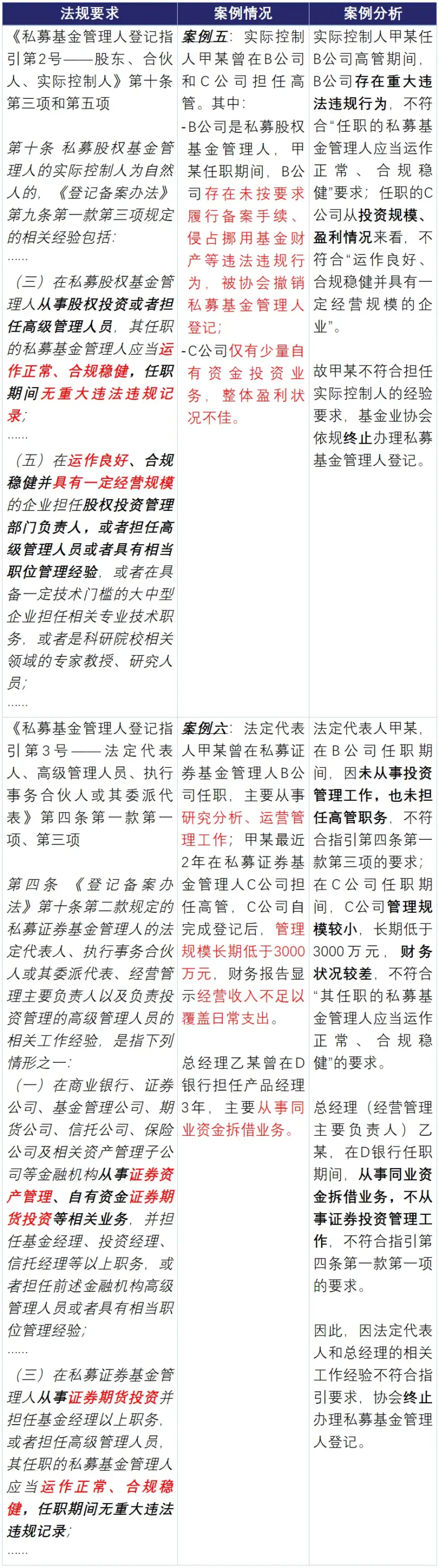 案例五和案例六分别对《私募基金管理人登记指引》中针对自然人实际控制人、私募证券基金管理人高管的专业经验要求,以场景化的实例形式进行了细化分析,为市场从业者提供了具象化参考。相关要点我们总结如下: