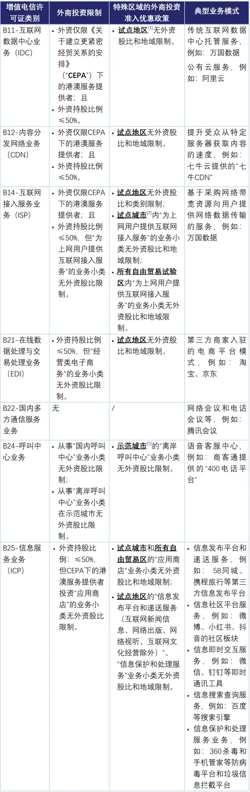 在长期的业务实践和对增值电信业务的研究过程中,我们发现下述增值电信业务种类是企业高频关注的种类,相关业务模式和外资准入要求如下: