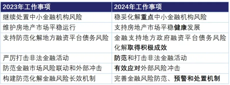 具体工作层面,2024年延续并深化了2023年防范化解金融风险隐患的工作思路。根据2023年和2024年《国务院关于金融工作情况的报告》,防范化解金融风险隐患的六方面工作事项分别如下: