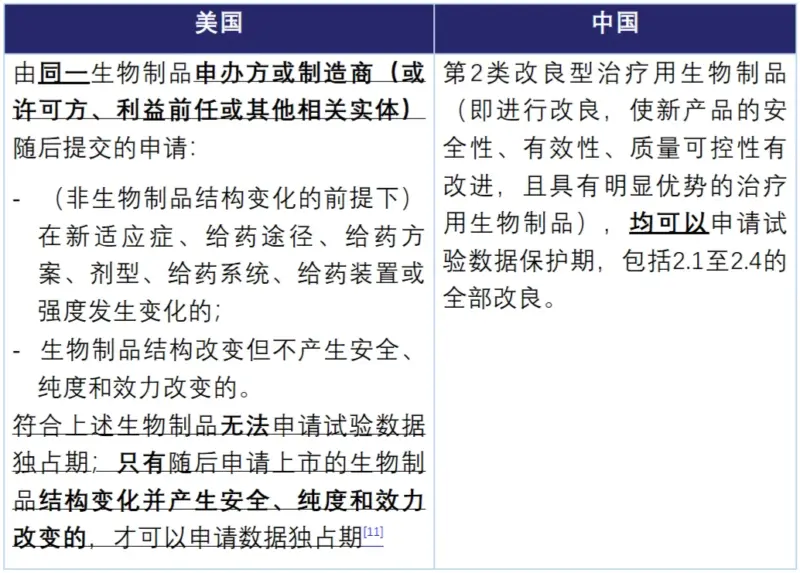 在生物制品试验数据保护下,本次《实施办法》另一亮点在于第2类改良型生物制品,极大放宽了对改良生物制品数据保护范围的限制:从目前的《实施办法》来看,即便是已经取得创新治疗用生物制品上市许可的申办方、制造商等相关实体,只要取得了符合要求的改良,均可以在中国申请试验数据保护(如下表对比所示)