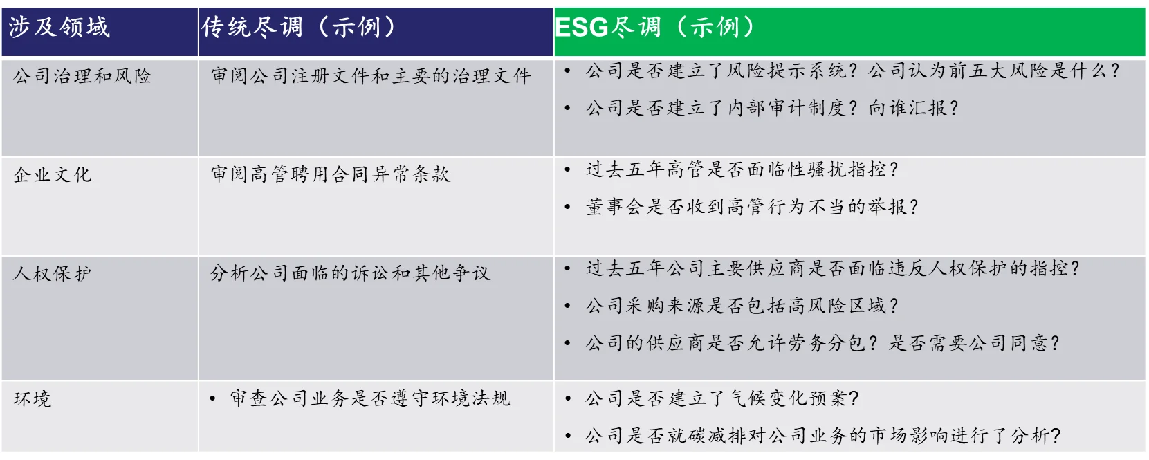 与传统法律尽调相比,ESG尽调往往远超过法律,涉及企业声誉、治理和利益相关方风险等。而传统法律尽调更侧重资产和项目的法律权属、合同权利、争议事项等,但可能无法揭示环境、社会、治理方面更广泛的风险。一些具体区分如下表: