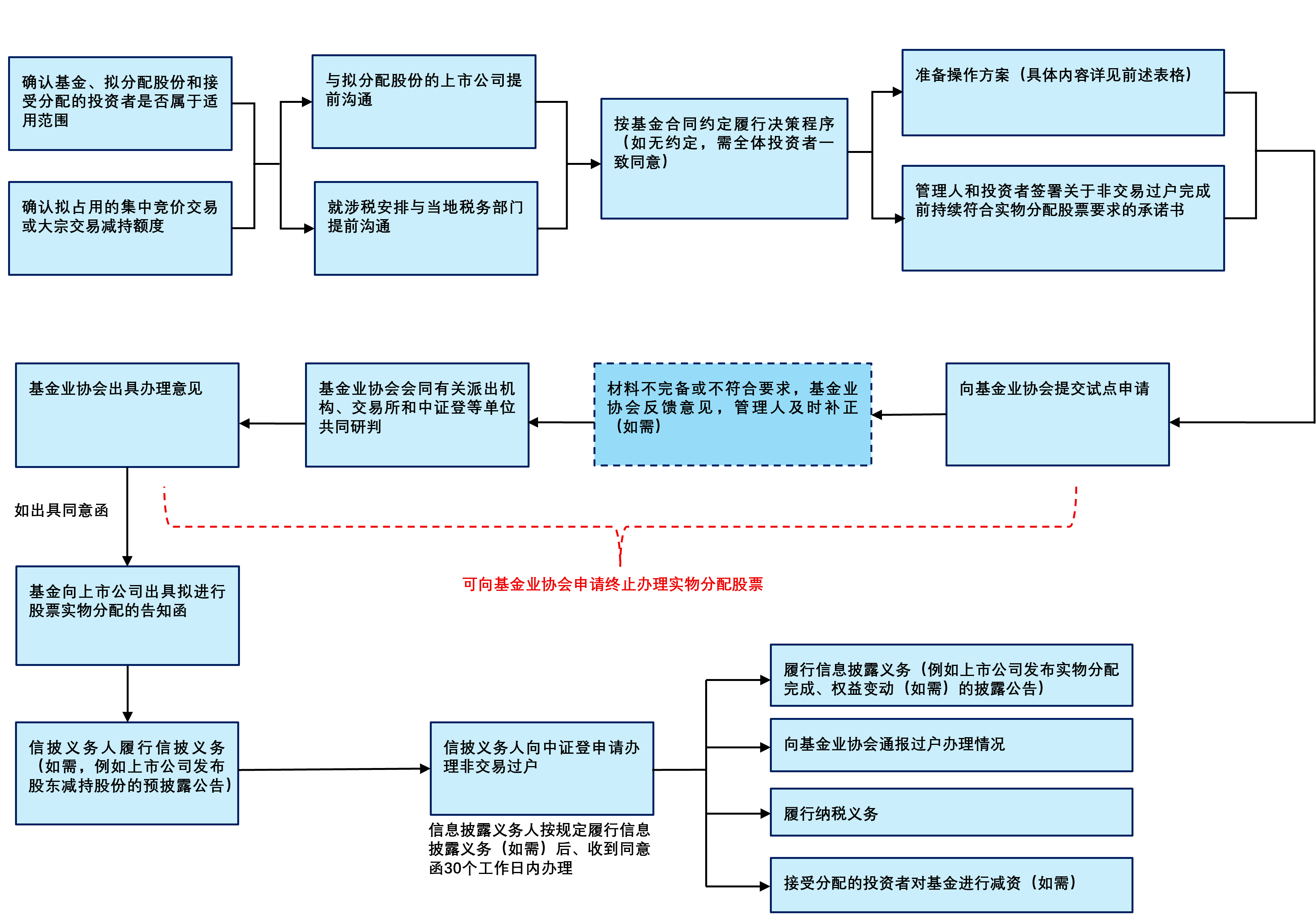 值得注意的是,在提交申请材料后至基金业协会出具同意函前的期间内,基金管理人亦可向基金业协会申请终止办理实物分配股票。但申请终止后一年内,基金业协会不再接收该基金管理人就同一基金实物分配股票的申请;如同一基金管理人就其管理的其他基金申请实物分配股票的,基金业协会仍将按程序接收。