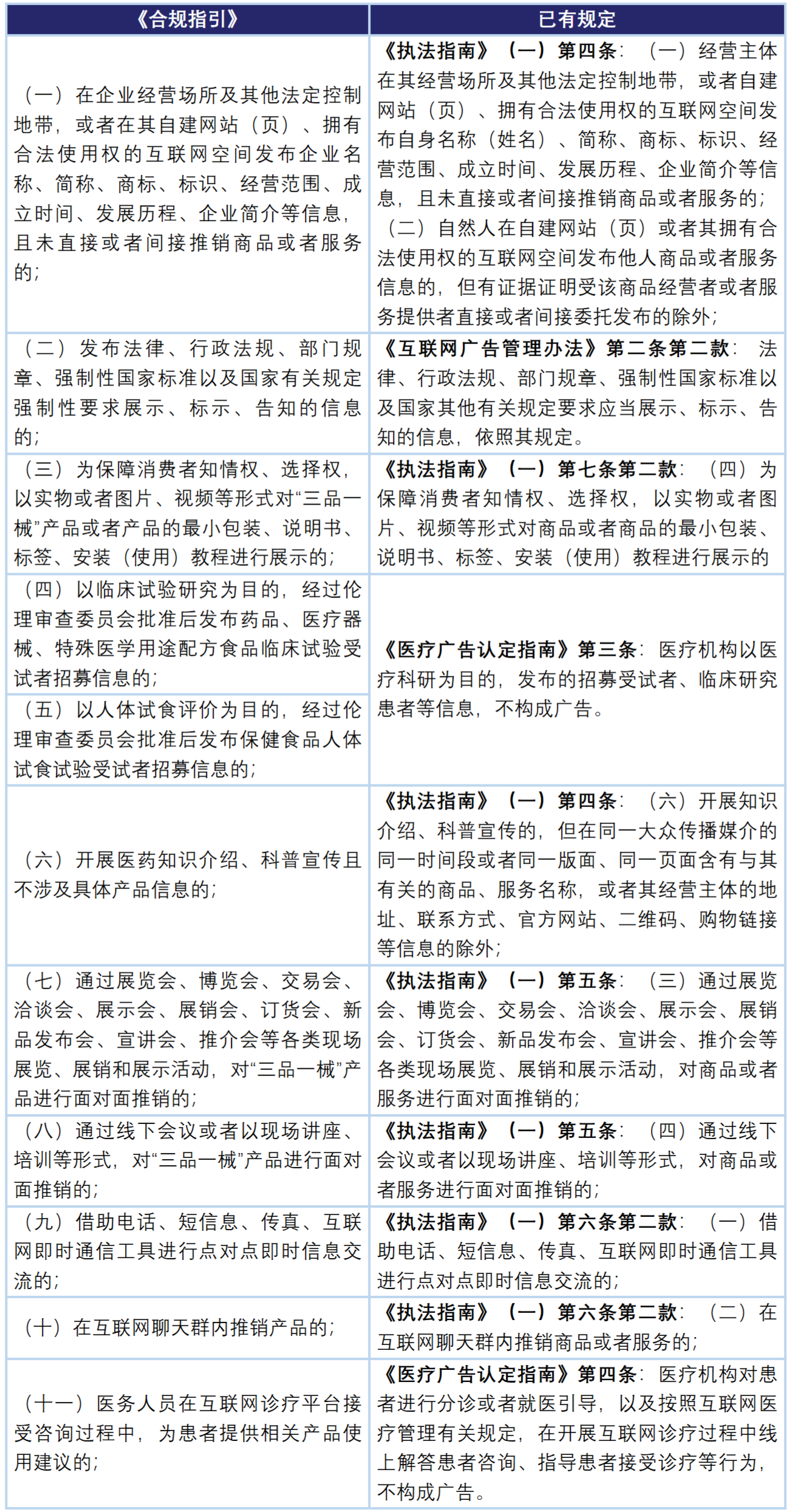 三品一械广告的一个基本要求是要事先履行广告审查。因此,对于三品一械企业而言,哪些是广告、哪些属于非广告宣传显得尤为重要,也是实践中最困扰企业的难题之一。《合规指引》第六条第二款规定了十一项不属于广告的情形,这十一项情形全面吸收和总结了《〈中华人民共和国广告法〉适用问题执法指南(一)》(“《执法指南(一)》”)《互联网广告管理办法》及《医疗广告指南》等相关规定,并在三品一械领域作了进一步说明。相关规定的对比详见下表。